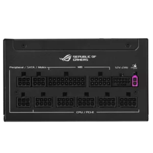 Le ROG Strix 1000 W Gold Aura Edition est logé dans un châssis en aluminium solide et élégant qui fait également office de dissipateur thermique pour le transformateur d’alimentation interne, ce qui contribue à réduire les températures et à minimiser le bruit.