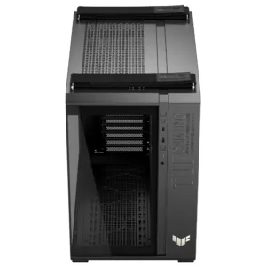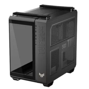 Le TUF Gaming GT502 configure des zones de refroidissement indépendantes pour le CPU et le GPU. Les panneaux en verre trempé offrent une vue teintée délicate qui met en valeur votre configuration. Le panneau avant comporte un port USB 3.1 Type-C mûr pour des vitesses de transfert allant jusqu’à 10 Gb/s. Les panneaux latéraux peuvent être retirés en appuyant simplement sur un bouton dissimulé à l’arrière du châssis. Deux sangles durables et détachables, pouvant supporter jusqu’à 30 kg, facilitent le déplacement du châssis, même lorsqu’il est chargé de matériel.