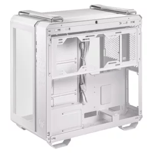 Le TUF Gaming GT502 configure des zones de refroidissement indépendantes pour le CPU et le GPU. Les panneaux en verre trempé offrent une vue teintée délicate qui met en valeur votre configuration. Le panneau avant comporte un port USB 3.1 Type-C mûr pour des vitesses de transfert allant jusqu’à 10 Gb/s. Les panneaux latéraux peuvent être retirés en appuyant simplement sur un bouton dissimulé à l’arrière du châssis. Deux sangles durables et détachables, pouvant supporter jusqu’à 30 kg, facilitent le déplacement du châssis, même lorsqu’il est chargé de matériel.