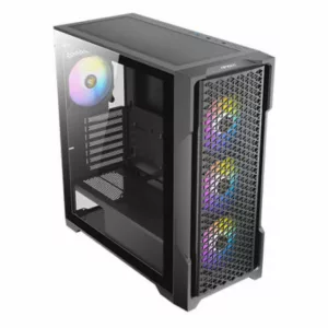 Le boitier Antec AX90 présente une conception pensée pour d’excellentes performances de refroidissement grâce à ses quatre ventilateurs ARGB 120 mm fournis et de nombreux emplacements pour installer d’autres ventilateurs ainsi que sa façade maillée. Le panneau latéral en verre trempé offre une vue dégagée sur votre configuration.