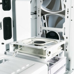 Côté refroidissement, le boîtier HAF500 possède 8 emplacements pour ventilateurs de 120 mm et une compatibilité watercooling avec possibilité de monter jusqu’à 2 radiateurs de 360 mm (avant et haut). Pour vous apporter un flux d’air optimisé, Cooler Master livre ce modèle avec 4 ventilateurs inclus. 2 éléments ARGB de 200 mm sont positionnés à l’avant, un autre ventilateur ARGB 120 mm est lui fixé à l’arrière tandis qu’un dernier de 120 mm (non RGB) est placé au niveau de la cage HDD. Ce dernier est rotatif et permet le refroidissement du GPU. Pour l’éclairage ARGB, le hub inclus favorisera la personnalisation de l’éclairage.
