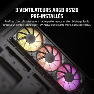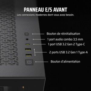 Le Corsair 3500X est un boîtier PC gamer panoramique offrant une vue large et impeccable sur votre configuration. Il est équipé de deux panneaux en verre trempé sur la façade et le côté. Il peut accueillir une carte mère Micro ATX / Mini ITX / ATX / E-ATX, une carte graphique jusqu’à 410 mm, une alimentation ATX de 180 mm et un ventirad de 170 mm. De plus, il possède deux ports USB 3.2, 1 port USB Type C 3.2 et deux connecteurs jack 3.5 mm pour votre casque.