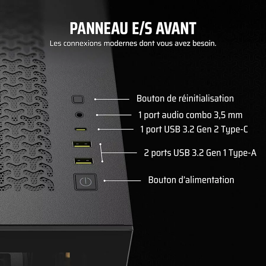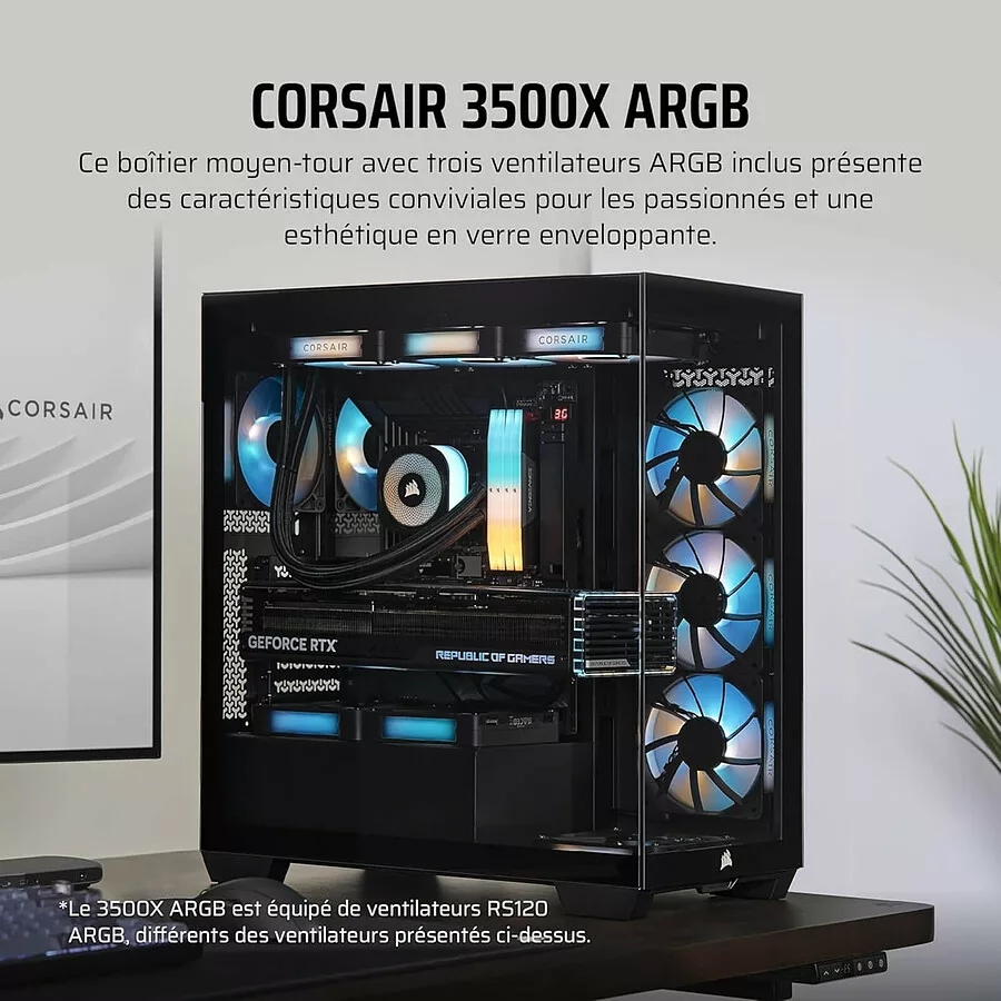 Le boîtier moyen Tour Corsair 3500X offre une superbe vue panoramique de votre configuration à travers ses deux faces en verre trempé. Cette vitrine ne serait rien sans un système de refroidissement aux multiples possibilités, grâce à dix emplacements pour ventilateurs de 120 mm et la prise en charge de radiateurs de 360 mm sur le côté et en haut. Le 3500X de Corsair est par ailleurs compatible avec les cartes mères ASUS BTF et MSI Project Zero, dissimulant ainsi vos câbles et branchements.