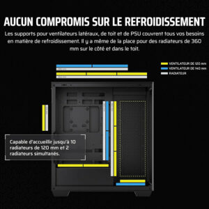 En ce qui concerne les emplacements de ventilation, le boîtier Corsair propose jusqu’à 10 emplacements au maximum. Il peut prendre en charge un kit de watercooling jusqu’à 360 mm de radiateur.