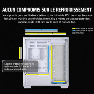 En ce qui concerne les emplacements de ventilation, le boîtier Corsair propose jusqu’à 10 emplacements au maximum. Il peut prendre en charge un kit de watercooling jusqu’à 360 mm de radiateur.