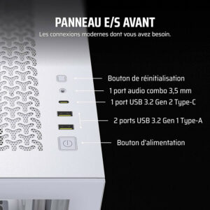 Le Corsair 3500X est un boîtier PC gamer panoramique offrant une vue large et impeccable sur votre configuration. Il est équipé de deux panneaux en verre trempé sur la façade et le côté. Il peut accueillir une carte mère Micro ATX / Mini ITX / ATX / E-ATX, une carte graphique jusqu’à 410 mm, une alimentation ATX de 180 mm et un ventirad de 170 mm. De plus, il possède deux ports USB 3.2, 1 port USB Type C 3.2 et deux connecteurs jack 3.5 mm pour votre casque.