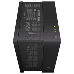 Le boîtier moyen Tour à deux compartiments Corsair 6500D AirFlow fournit un flux d’air optimisé grâce à des panneaux complètement maillés et une conception à deux compartiments pour une configuration organisée. Il est capable d’accueillir jusqu’à 13 ventilateurs de 120 mm ou 9 ventilateurs de 140 mm et pourvu de plusieurs options de montage de radiateur au sommet, en bas et sur le côté, votre système fournira d’excellentes performances. La compatibilité avec des cartes mères à connecteurs arrière vous permet d’avoir une vue sans câble de votre système.