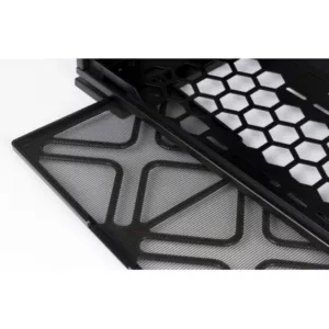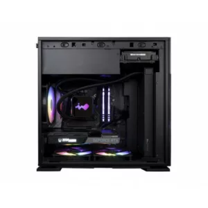 La façade perforée en mesh du 327, les panneaux latéraux avec des évents en nid d’abeille et les ouvertures dans le bas apporte un flux d’air important. Trois ventilateurs Luna AL120 case sont préinstallés. Jusqu’à cinq ventilateurs peuvent prendre place pour les systèmes les plus exigeants.