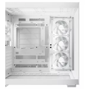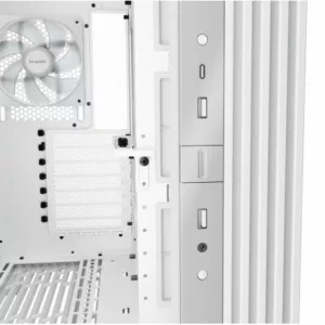 Le Light Base 600 DX White ne dispose d’aucun ventilateur. Cependant, avec ses dimensions généreuses, il peut accueillir un total de 10 ventilateurs, jusqu’à 2 radiateurs de 360 mm simultanément, une carte mère ATX et les cartes graphiques les plus puissantes. Grâce à son design à 2 chambres, les disques durs et les câbles sont dissimulés à l’arrière, sans gêner la circulation de l’air.