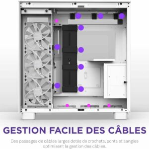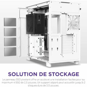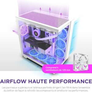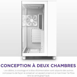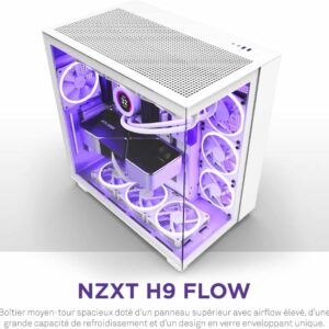 Le boitier moyen tour NZXT H9 Flow est conçu pour accueillir et refroidir les cartes graphiques les plus puissantes grâce à ses capacités de dissipation thermique étendues grâce à sa prise en charge de dix ventilateurs et ses nombreuses possibilités de montage de watercooling.