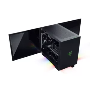Le boitier mini tour Tomahawk Mni-ITX de Razer propose un design gaming assumé avec un rétroéclairage RGB Razer Chroma, deux portes pivotantes en verre trempé et un espace intérieur optimisé pour accueillir les composants les plus volumineux et les plus performants. Il vous permettra de repousser les limites de votre setup de jeu et sa gestion de câbles intégrée offrira un flux d’air optimisé.