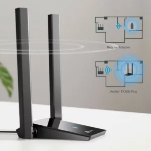 L’Archer TX20U Plus de TP-Link est un adaptateur Wi-Fi 6 AX1800 (AX1201 + AX574) Dual Band avec interface USB 3.0 qui dispose de 2 antennes à gain élevé réglables et multidirectionnelles pour une réception optimale dans toutes les situations. À vous les conférences sans coupures et le jeu fluide !