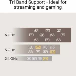 Parfait pour le streaming et les jeux : La prise en charge tri bande vous offre la bande de fréquences 6 GHz pour un streaming UHD 4K fluide et des jeux à faible latence.