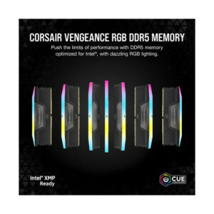 La mémoire Corsair Vengeance RGB DDR5 fournit des performances et des fréquences plus élevées avec de meilleures capacités optimisées pour les cartes mères Intel tout en illuminant votre PC avec un éclairage RGB dynamique sur dix zones personnalisables individuellement. Les puces mémoire à haute fréquence triées sur le volet permettent un traitement, un rendu et une mémoire tampon plus rapides que jamais, avec la régulation de tension intégrée pour un overclocking à la fois aisé et contrôlé avec précision. Prenez le contrôle avec le logiciel CORSAIR iCUE qui permet la personnalisation de l’éclairage RGB, la surveillance de la fréquence en temps réel, la régulation de la tension intégrée et la personnalisation de profils Intel XMP 3.0. Un circuit imprimé personnalisé fournit une qualité de signal optimale pour des performances et une stabilité exceptionnelles sur les cartes mères DDR5 Intel les plus récentes. Avec ses performances de pointe et son éclairage RGB éblouissant, la mémoire DDR5 Vengeance RGB montre la voie.