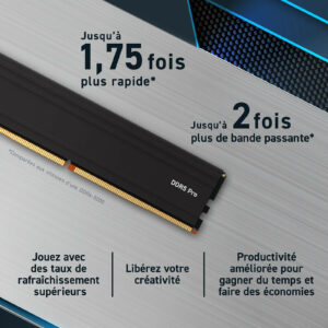 Une meilleure productivité pour les créatifs et les professionnels : Avec 2 fois plus de bande passante que la génération précédente, la mémoire DDR5 Crucial Pro permet une gestion multitâche de niveau supérieur et un traitement plus rapide pour venir à bout de charges de travail importantes en moins de temps.