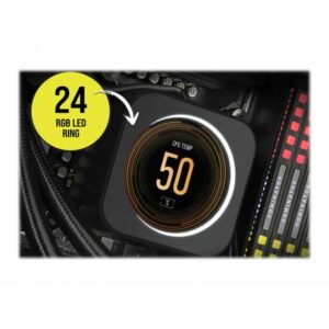 Logiciel Corsair iCUE vous permet de basculer entre une variété d’options d’affichage, telles que la vitesse du ventilateur, la température du processeur, des images, des GIF… tout en vous permettant de synchroniser l’éclairage RGB sur l’ensemble de vos appareils compatibles avec iCUE.