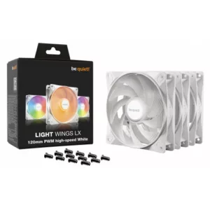 Le be quiet! Light Wings LX 120 mm PWM High Speed est un ventilateur ARGB de 120 mm conçu pour offrir un refroidissement efficace tout en restant silencieux. Il se démarque par son design élégant avec des pales dépolies et une finition noir mat. Il est équipé de 16 LED RGB adressables.