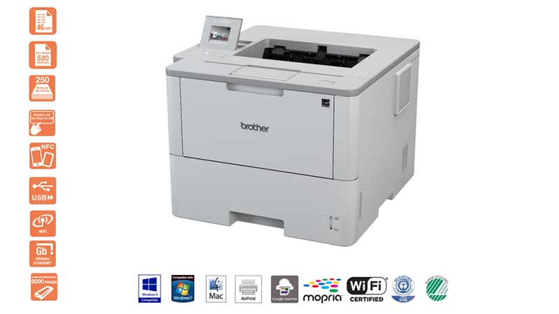 L’imprimante laser monochrome sans fil Brother HL-L6300DW répondra à vos exigences. Économe et rapide, elle sera un atout essentiel à votre bureau grâce notamment à son impression de 46 ppm, une résolution de 1200 x 1200 dpi, une mémoire intégrée de 256 Mo, un bac d’entrée de 520 feuilles ou encore l’impression en recto verso automatique et la connectivité avancée Wi-Fi/Ethernet/USB/NFC.