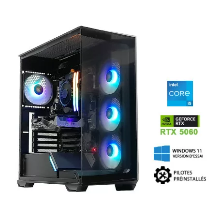 CORE i5-14400F – B760 GEN5 – RTX5060 8Go – VENGEANCE RGB DDR5 32Go – SSD 1To – 650W – Windows 11 en version d’essai avec ses pilotes preinstalles.