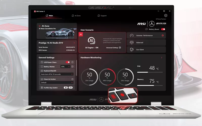 Le Prestige 16 AI+ Mercedes-AMG B2VM intègre un processeur Intel Core Ultra série 2, qui facilite les tâches informatiques intensives et les rend plus efficaces. Un accélérateur d’IA (ou NPU) de dernière génération est également présent pour assurer le support d’une charge de travail plus importante et pour, comme son nom l’indique, accélérer les calculs intensifs des logiciels propulsés par l’IA tout en modérant leur consommation. Préparez-vous à une productivité plus puissante et plus efficace !