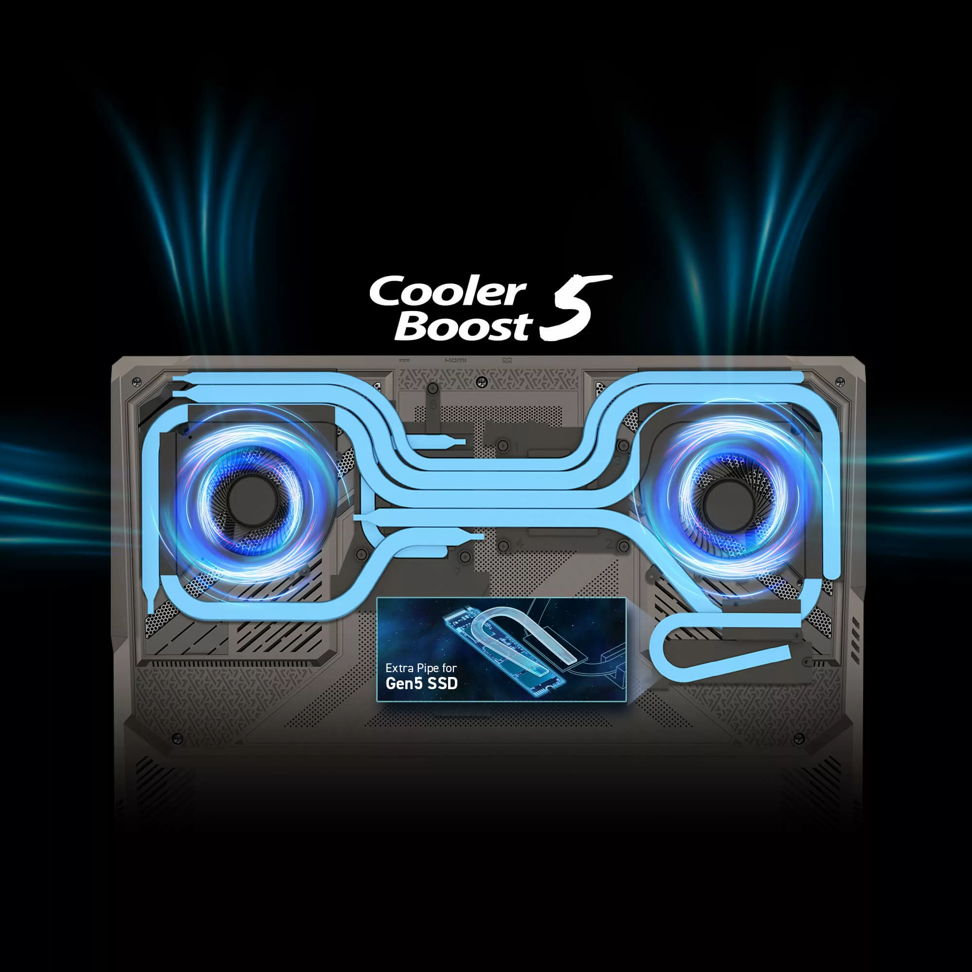 Refroidissement Cooler Boost 5 avec deux ventilateurs, sept caloducs et un caloduc dédié au SSD PCIe Gen5