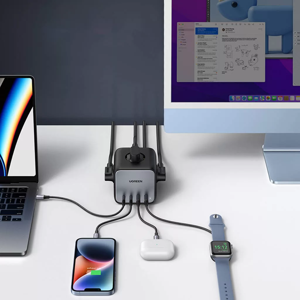 Multiprise UGREEN Nexode DigiNest Cube 3 prises, 3680W, AC, Schuko, 2x USB-C, 2x USB-A, 1.8m, Gris