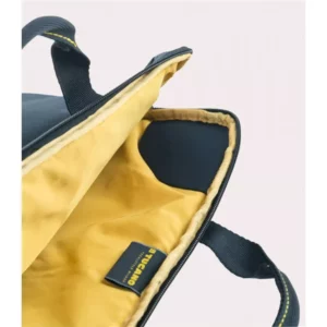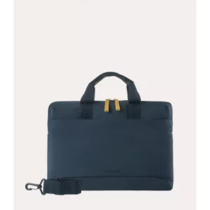 Sacoche informatique super slim fabriqué en tissu obtenu à partir de plastique recyclé avec détails de couleurs différentes pour ordinateur portable 14″ et MacBook Pro 14″. Un seul compartiment intérieur avec élastiques angulaires en néoprène pour bloquer le dispositif. La face arrière est doté d’une grande poche. Bandoulière amovible et double poignées en rubans.