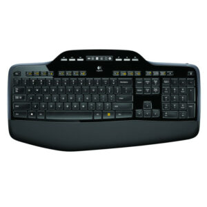 Logitech Wireless Desktop MK710, quand confort et productivité ne font qu’un. Ce clavier ultra-plat est équipé des touches Logitech Incurve keys, qui sont si confortables qu’elles sembleraient conçues spécialement pour épouser la forme de vos doigts, et d’un repose-poignets matelassé. Un seul coup d’œil au tableau de bord LCD vous renseigne instantanément sur l’état des piles, du verrouillage des majuscules et du clavier numérique par le biais d’icônes afin de ne pas perturber votre rythme de saisie. Avec sa technologie laser, la souris offre une bonne précision (1 000 dpi) et possède un design ergonomique qui réserve une bonne prise en main pour tous. La molette peut être décrantée à l’aide d’un simple bouton pour permettre un défilement vertical ultrarapide. Elle est dotée de 8 boutons qui sont pour la plupart personnalisables.