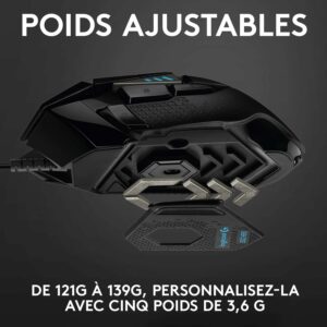 La Logitech G502 Hero dispose de cinq poids de 3.6g afin de la personnaliser à votre convenance. Utilisez-les selon le poids que vous souhaitez ajouter ou enlever dans chaque position. Cette souris peut s’adapter exactement à votre convenance.