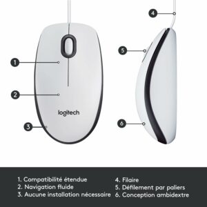 Avec la souris Logitech Mouse M100, allez à l’essentiel en matière de confort et de fiabilité. Sa forme, de taille standard, est adaptée à la main droite comme à la main gauche et permet de positionner sa main confortablement. De plus, le capteur optique haute définition (1 000 dpi) de la souris M100 vous garantit un contrôle réactif et fluide du pointeur, permettant un suivi précis et une sélection de texte aisée.Aucun logiciel n’est à installer avant d’utiliser la M100, il vous suffit de connecter le câble à un port USB.