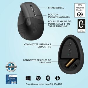 Avec la Logitech Lift dites oui au confort. Cette souris ergonomique verticale vous permet travailler des heures durant sans ressentir la moindre douleur dans votre poignet. Parfaitement adaptée aux mains de petite taille et de taille moyenne, elle possède un revêtement légèrement texturé, 6 boutons faciles d’accès, un capteur optique de 4000 dpi ainsi qu’un repose-pouce confortable.