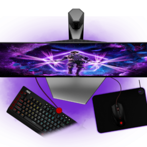 Notre nouveau support. Conçu en collaboration avec des professionnels de l’eSport, il vous permet de maximiser l’espace libre pour tous vos périphériques. La base de l’écran est conçue pour réduire l’encombrement de votre écran sur votre bureau et vous permet même de poser votre clavier dessus. Le support comprend une gestion des câbles pour maintenir votre bureau propre. Peu importe le genre dans lequel vous compétitionnez, nous voulons que vous vous sentiez comme un professionnel.