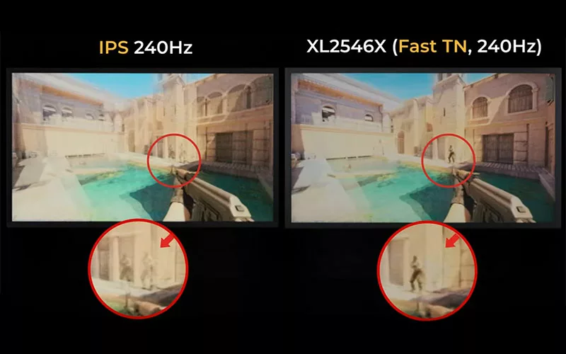 En comparaison avec une dalle IPS classique, une dalle Fast TN offre des contours plus précis et plus nets pour les images en mouvement, ce qui favorise la concentration et réduit la distraction due à l’image rémanente parasite issue des mouvements dans le jeu. La nouvelle dalle TN, parfaitement calibrée, réduit avec efficacité les dépassements (ou overshoot) pouvant être observés sur une dalle classique en raison d’une saturation excessive en cristaux liquides. Par ailleurs, la lumière blanche aveuglante s’estompe beaucoup plus rapidement qu’avec la technologie IPS, ce qui permet aux joueurs de voir les contours de l’ennemi plus tôt.