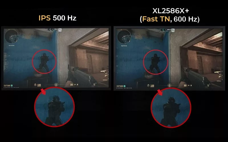 En comparaison avec une dalle IPS classique, une dalle Fast TN offre des contours plus précis et plus nets pour les images en mouvement, ce qui favorise la concentration et réduit la distraction due à l’image rémanente parasite issue des mouvements dans le jeu. La nouvelle dalle TN, parfaitement calibrée, réduit avec efficacité les dépassements (ou overshoot) pouvant être observés sur une dalle classique en raison d’une saturation excessive en cristaux liquides. Par ailleurs, la lumière blanche aveuglante s’estompe beaucoup plus rapidement qu’avec la technologie IPS, ce qui permet aux joueurs de voir les contours de l’ennemi plus tôt.