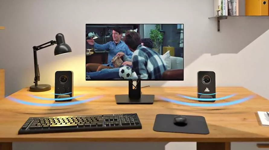 Ce moniteur dispose d’entrées HDMI et DisplayPort, complétées par un port Ethernet un hub USB à quatre ports et une prise casque, facilitant la connexion des ordinateurs et des périphériques. Les haut-parleurs intégrés permettent une restitution sonore fonctionnelle sans équipement externe supplémentaire.