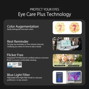 Profitez d’une expérience visuelle confortable grâce au réglage en hauteur : choisissez l’un des trois réglages de hauteur (par incréments de 25 mm) pour obtenir la position de visualisation idéale. Ajustez facilement les paramètres de votre moniteur grâce à l’application intuitive DisplayWidget Center, sans avoir à toucher les boutons physiques sur le moniteur. Pour un confort constant, le moniteur ASUS VU279CFE ajuste automatiquement la luminosité à l’éclairage ambiant de votre environnement, ce qui réduit la fatigue oculaire. Toujours dans un souci de confort oculaire, ce moniteur bénéficie des technologies Flicker-Free et Blue Light Filter et propose des fonctions d’augmentation des couleurs et de rappel de repos, lorsqu’il est temps de prendre une pause.