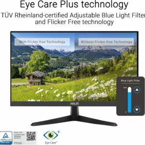 La technologie ASUS Flicker-Free, certifiée par TÜV Rheinland, réduit le scintillement et crée une expérience visuelle confortable. Cette technologie réduit la fatigue des yeux et les autres effets néfastes que peuvent subir ceux qui passent de longues heures devant leurs écrans.