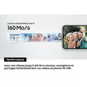 Une capacité de stockage étendue, des vitesses de lecture et d’écriture élevées et une durabilité exemplaire, la carte microSD Samsung EVO Plus possède toutes les qualités pour répondre à vos besoins du quotidien. Vitesse de transfert jusqu’à 130 Mo/s, compatibilité PC, tablette, smartphone et d’autres appareils et protection à 6 niveaux font de cette carte mémoire une solution efficace pour stocker vos fichiers, vidéos et photos.