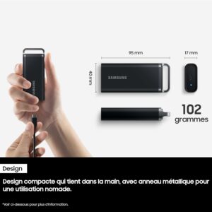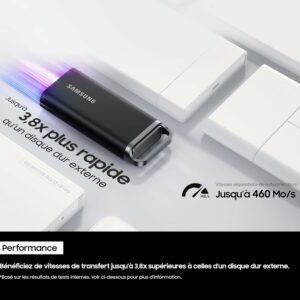 Avec une vitesse de lecture et écriture jusqu’à 460 Mo/s, le T5 EVO peut gérer des transferts de fichiers volumineux avec des performances plus rapides et plus soutenues que celles des disques durs externes.