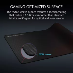 Le tapis de souris ASUS ROG Scabbard II est prêt à résister à n’importe quelle bataille. Il est fait d’un tissu durable avec un nano-revêtement de qualité militaire qui repousse l’eau, l’huile et la poussière, vous offrant une surface de glissement optimale. En outre, il est doté de bords plats anti-effilochage et d’une base en caoutchouc antidérapante pour rester bien en place lorsque le combat se fait intense.