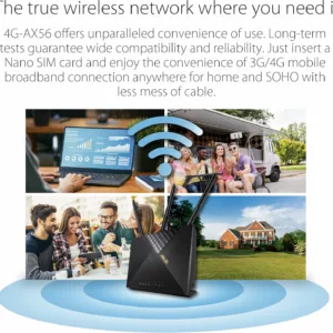 Doté de la technologie Wi-Fi AX, le 4G-AX8U d’ASUS est un modem/routeur 4G LTE Advanced qui propose du Wi-Fi 6 AX Dual Band AX1800 (AX1201 + AX574). Il vous suffit d’y insérer votre carte nano-SIM pour profiter de la connexion mobile 3G/4G où vous en avez besoin, que ce soit chez vous ou au bureau, pour du divertissement comme pour du télétravail.