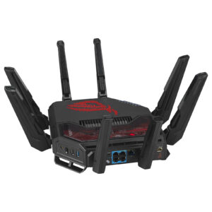 L’ASUS ROG Rapture GT-BE19000 est un routeur gaming WiFi 7 tribande conçu pour l’informatique de nouvelle génération, offrant des vitesses sans fil allant jusqu’à 19 Gbit/s et deux ports 10 Gbit/s. Le WiFi 7 (IEEE 802.11be) offre tous les avantages du WiFi 6/6E et étend plusieurs normes Wi-Fi existantes à un niveau supérieur, comme la bande passante de 320 MHz et le 4K-QAM. Le routeur offre une excellente portée grâce à ses 8 antennes, qu’il sera possible d’étendre de manière transparente avec la technologie AiMesh.