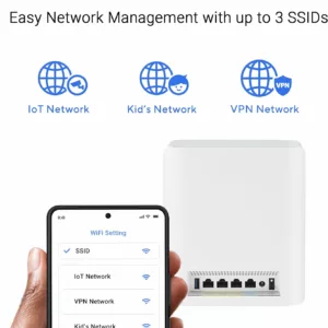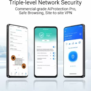 La technologie Smart AiMesh de nouvelle génération offre un backhaul maillé alimenté par l’IA avec MLO pour des performances optimisées et une faible latence. Vous pouvez profiter d’une expérience réseau plus stable et sécurisée sur tous les routeurs extensibles ASUS compatibles.
