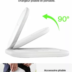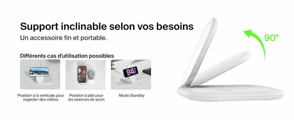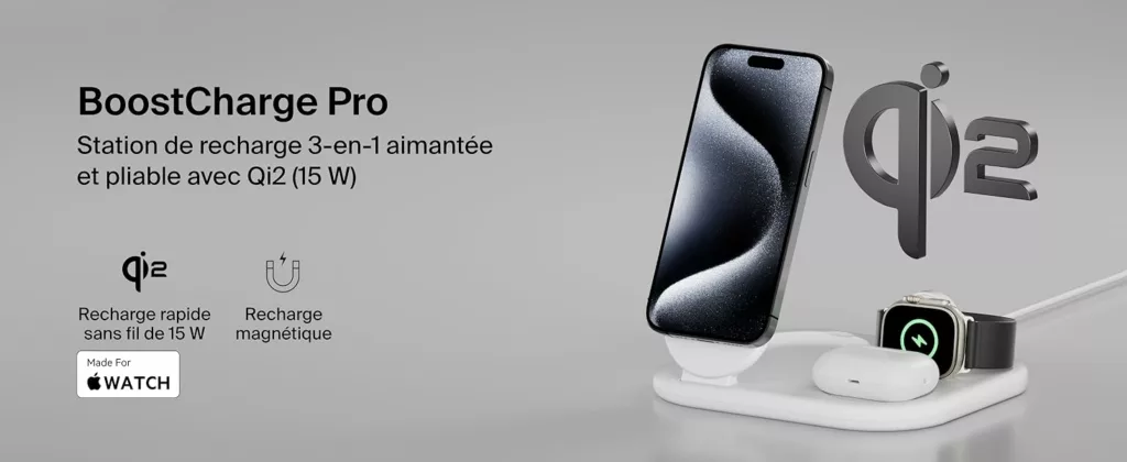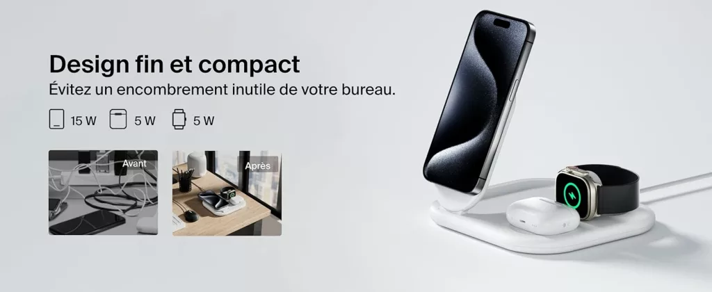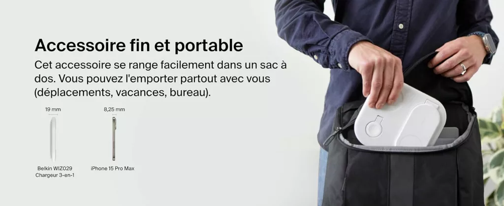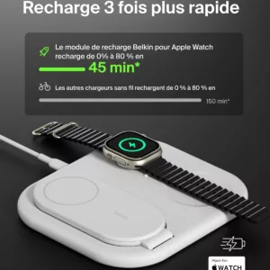 Le socle de recharge 3-en-1 aimanté et pliable Belkin BoostCharge vous permet de recharger rapidement votre iPhone ou tout appareil compatible Qi2 / MagSafe jusqu’à 15 W. Profitez d’une recharge simultanée de votre iPhone, AirPods et Apple Watch. Le nouveau module de recharge permet de recharger votre Apple Watch Series 9, 8, 7 ou Ultra et Ultra 2 de zéro à 80 % en 45 minutes†. * Sur la base de tests internes.Recharge d’un iPhone 15 de zéro à 50 % jusqu’à 2 fois plus rapide qu’une recharge Qi de 5 W et jusqu’à 1,5 fois plus vite qu’une recharge Qi de 7,5 W. Le temps de charge varie en fonction de l’environnement. Les résultats réels sont susceptibles de varier. ** Revêtement (sauf le câble et l’adaptateur secteur) contenant au minimum 75 % de plastique recyclé post-consommation. † Sur la base des tests réalisés en interne par notre laboratoire. Cet accessoire recharge votre Apple Watch Series 9 de zéro à 80 % en 45 minutes. Le résultat réel peut varier en fonction d’un certain nombre de facteurs (ancienneté de l’appareil, modèle) et en fonction de l’utilisateur. Belkin est la marque leader du marché des accessoires qui offre des solutions de haute qualité et innovantes depuis plus de 40 ans. Spécifications : Recharge sans fil rapide de 15 W certifiée Qi2 MPP Module de recharge sans fil rapide C962 pour l’Apple Watch (compatible avec toutes les marques tierces) Recharge sans fil Qi BPP de 5 W Compatibilité : compatible avec la fonction de recharge rapide de la plupart des appareils PD 3.1 (EPR) / PD 3.0 comme l’iPhone et appareils Qi2 (iPhone 15 Pro Max, iPhone 15 Pro, iPhone 15 Plus et iPhone 15. Matériaux en PCR Emballage dépourvu de matériau plastique Garantie 2 ans GSLMC à hauteur de 2 000 € Contenu de l’emballage : Socle de recharge 3-en-1 aimanté et pliable Adaptateur secteur USB-C de 36 W
