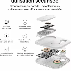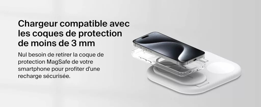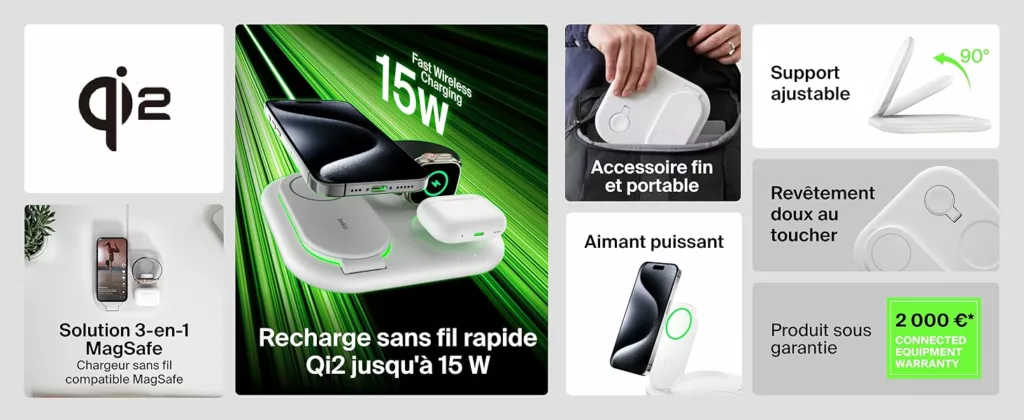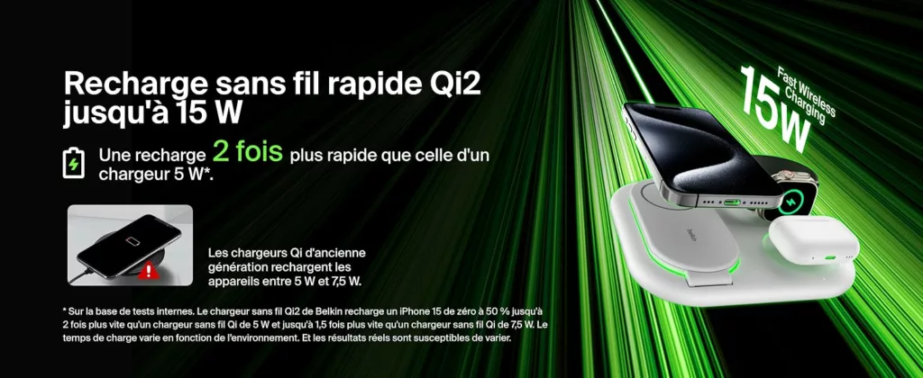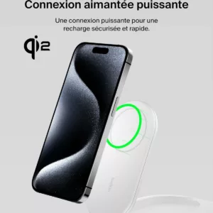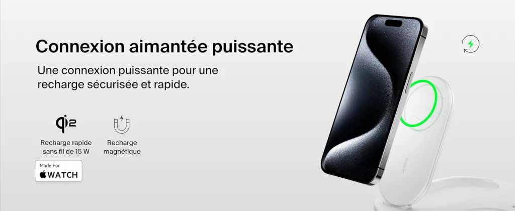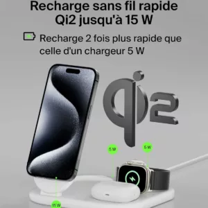 RECHARGE RAPIDE QI2 : rechargez rapidement jusqu’à 15 W votre iPhone ou tout appareil compatible Qi2 avec ce socle de recharge magnétique. La technologie Qi2 vous permet de profiter d’une recharge sans fil 2 fois plus rapide*.