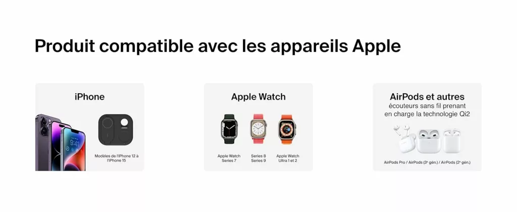 RECHARGE SIMULTANÉE : profitez d’une recharge rapide et simultanée de votre iPhone, Apple Watch et AirPods. Le module de recharge de 5 W est équipé d’une LED qui vous indique l’état de recharge de vos AirPods.